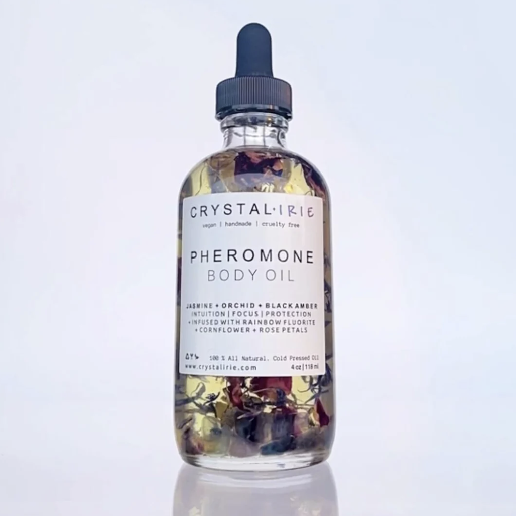 Discover the magical power of Pheromone Body Oil! Indulge in this ultimate sensory experience with this seductive blend of oils. Black Amber + Orchid + Jasmine, and musk collide to create a deeply intriguing, sexy, and sophisticated fragrance. Infused with Rainbow Fluorite crystals. Made with complex base notes of Mandarin, exotic woods, Ylang, and musk. Creates a unique and irresistible essence. Pheromone Body Oil infused with the energy of Rainbow Fluorite as It intensifies focus and ignites your intuition.