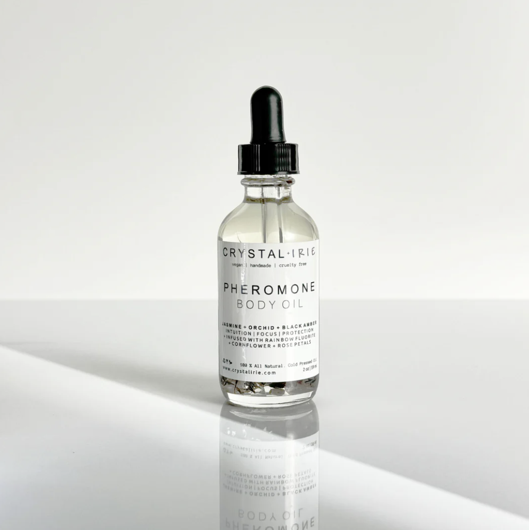 Apply a few drops of the Pheromone Body Oil to your pulse points—such as wrists, neck, behind the ears, and inner elbows—for a long-lasting, seductive scent that evolves with your body’s chemistry. Gently massage into clean, dry skin until fully absorbed. For an all-over glow, use after showering while your skin is still slightly damp. This lightweight, dry oil is perfect for daily use and can also be layered under your favorite perfume to enhance its depth and allure. Shake gently before each use to activate the energy of the infused Rainbow Fluorite crystals.